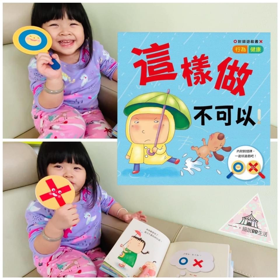 2. 每兩頁都有一個狀況問題,讓孩子想一想:故事裡的主角這樣做對嗎?並用對錯遊戲牌來作答。