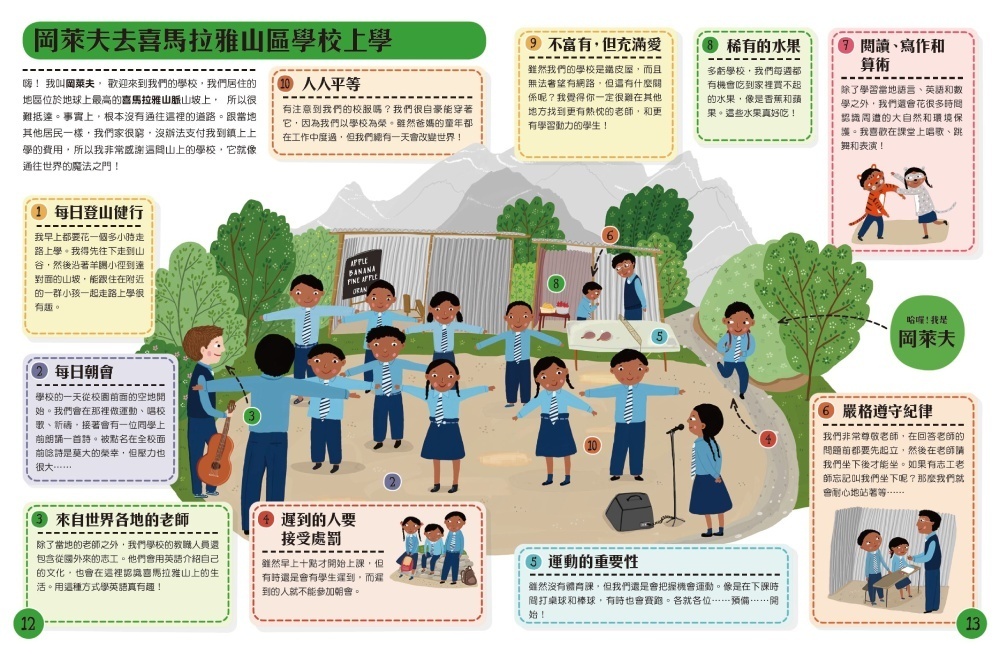 世界各地的孩子們又來跟大家見面啦!此系列的前兩本書《跟著世界各地的孩子一起慶祝節日》、《跟著世界各地的孩子一起過生活》上市至今廣受歡迎,我們也很高興能繼續出版系列新作。這次以最貼近孩子的「上學」為主題,介紹世界各地特別的上學方式,包含時間地點、服裝、校風,以及因應地形氣候的應變措施,豐富的內容同樣能讓孩子們大開眼界。除了像是伊朗、烏干達、喜馬拉雅山這些比較遙遠的地方,也有難民營、醫院學校、船上學校這些因應特殊情況而生的學校。透過世界各地孩子的眼光,讓我們了解上學的方式不只一種,而且這件看似普通的事,對許多人來說並不容易,也不是人人都能享有豐富的資源,除了國際觀之外,也能培養多元理解能力及同理心。