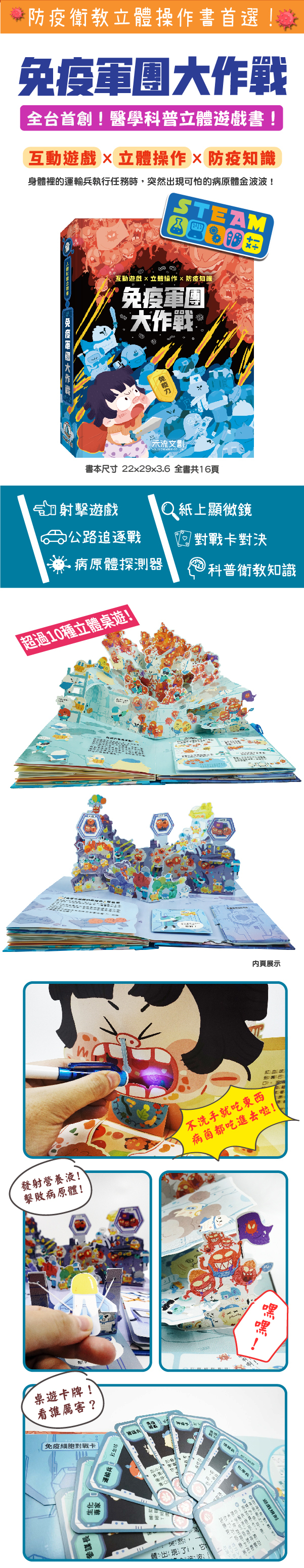 本書除了講解醫學知識,帶領小讀者認識人體免疫力之外,每頁都有豐富的立體機關,翻一翻、拉一拉、動一動,讓小讀者在動手操作中,獲得新奇的閱讀體驗,更能深入了解科普內容。