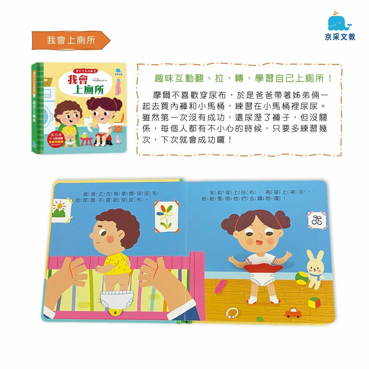 本書透過生活化的故事,讓孩子「練習自己上廁所」。故事裡,摩爾不喜歡穿尿布,於是爸爸帶著姊弟倆一起去買內褲和小馬桶,練習在小馬桶裡尿尿。雖然第一次沒有成功,還尿溼了褲子,但沒關係,每個人都有不小心的時候,只要多練習幾次,下次就會成功囉!