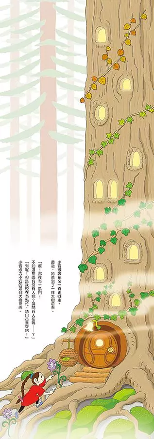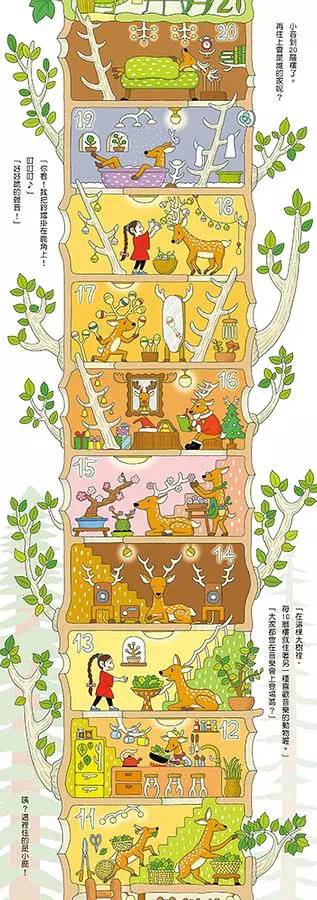 以直式跨頁圖,深入風格迥異、代表不同主人的大樹之家,每一層樓都是符合不同動物特性的精緻空間,超乎想像的驚喜,等你來探索!